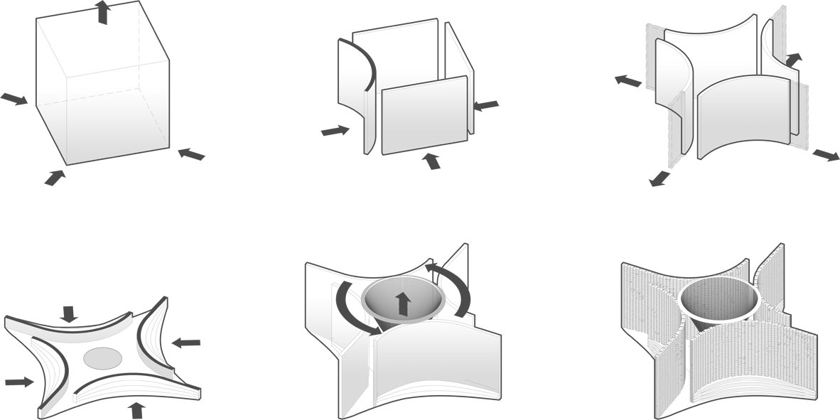 The architecture of the pavilion takes shape through four mirrored, identical curved walls, which create a central space between them. This configuration generates an intimate area for the user, a place for meditation and appreciation, while also embodying the main idea of a meeting point. On the outer curves, generated by the cross-shaped form of the pavilion, four agoras are created, providing the opportunity for a “meeting place” where users can gather around. In a simpler sense, this gives the pavilion a real meaning for the city as what it truly is, a meeting point.