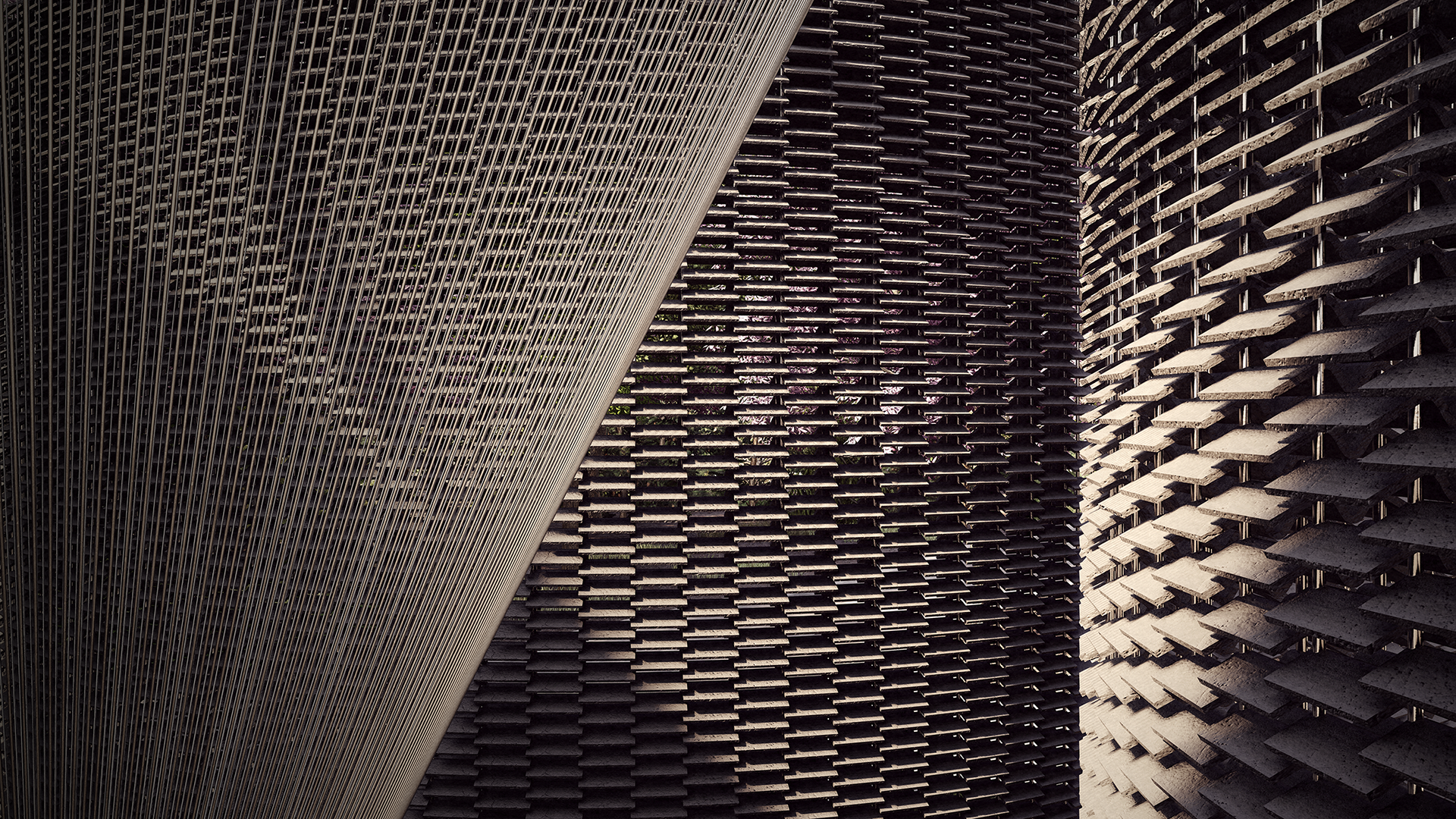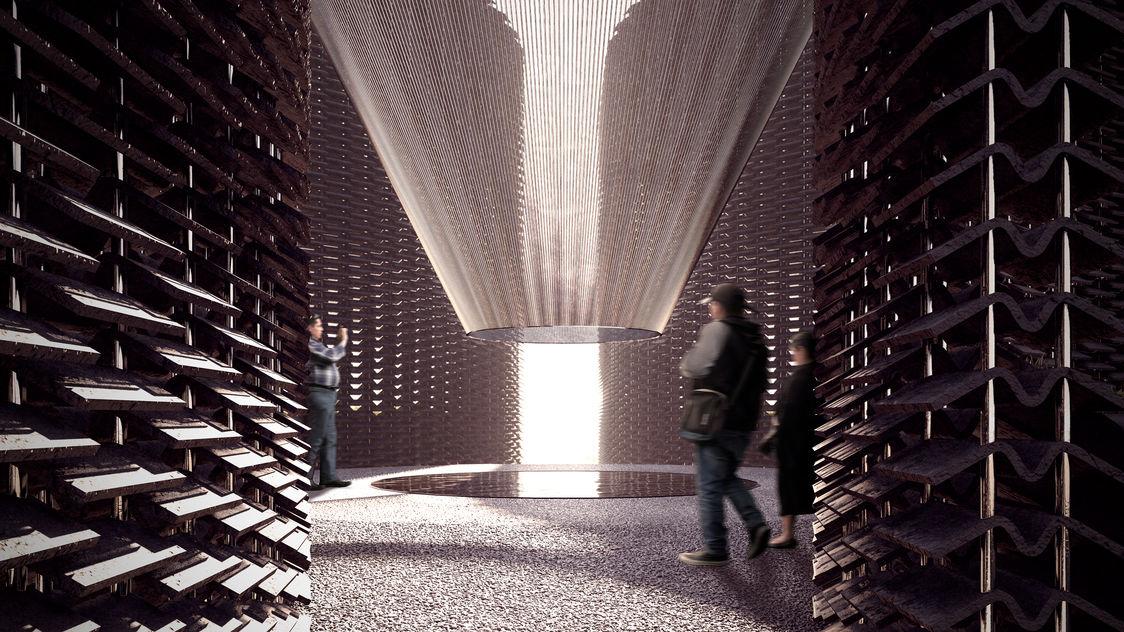 The materials chosen for the pavilion consist of specially shaped prefabricated grey concrete bricks, connected by aluminium tubes and highlighted by a chromed ring with tilting steel cables that frame the interior space of the pavilion.